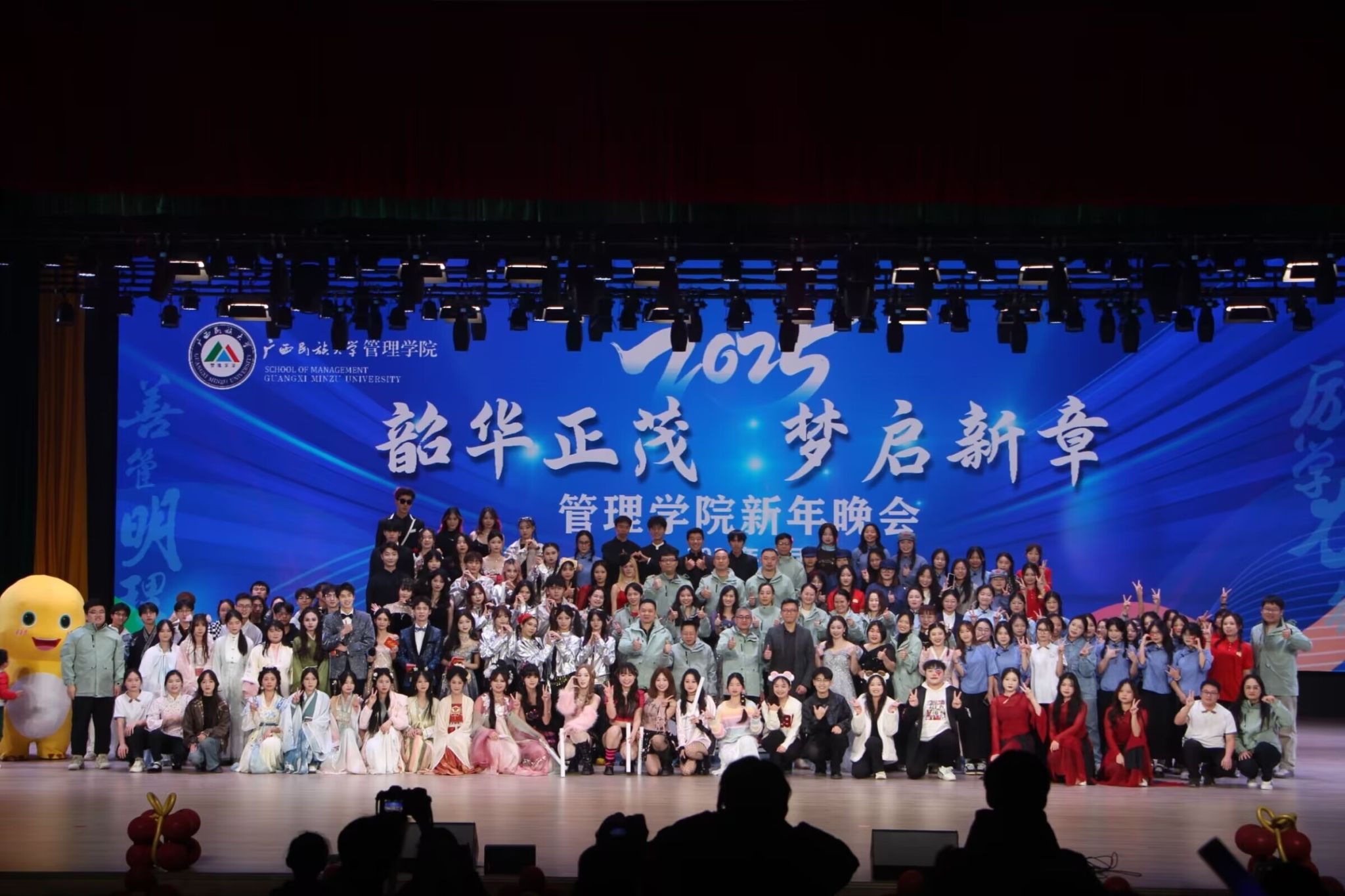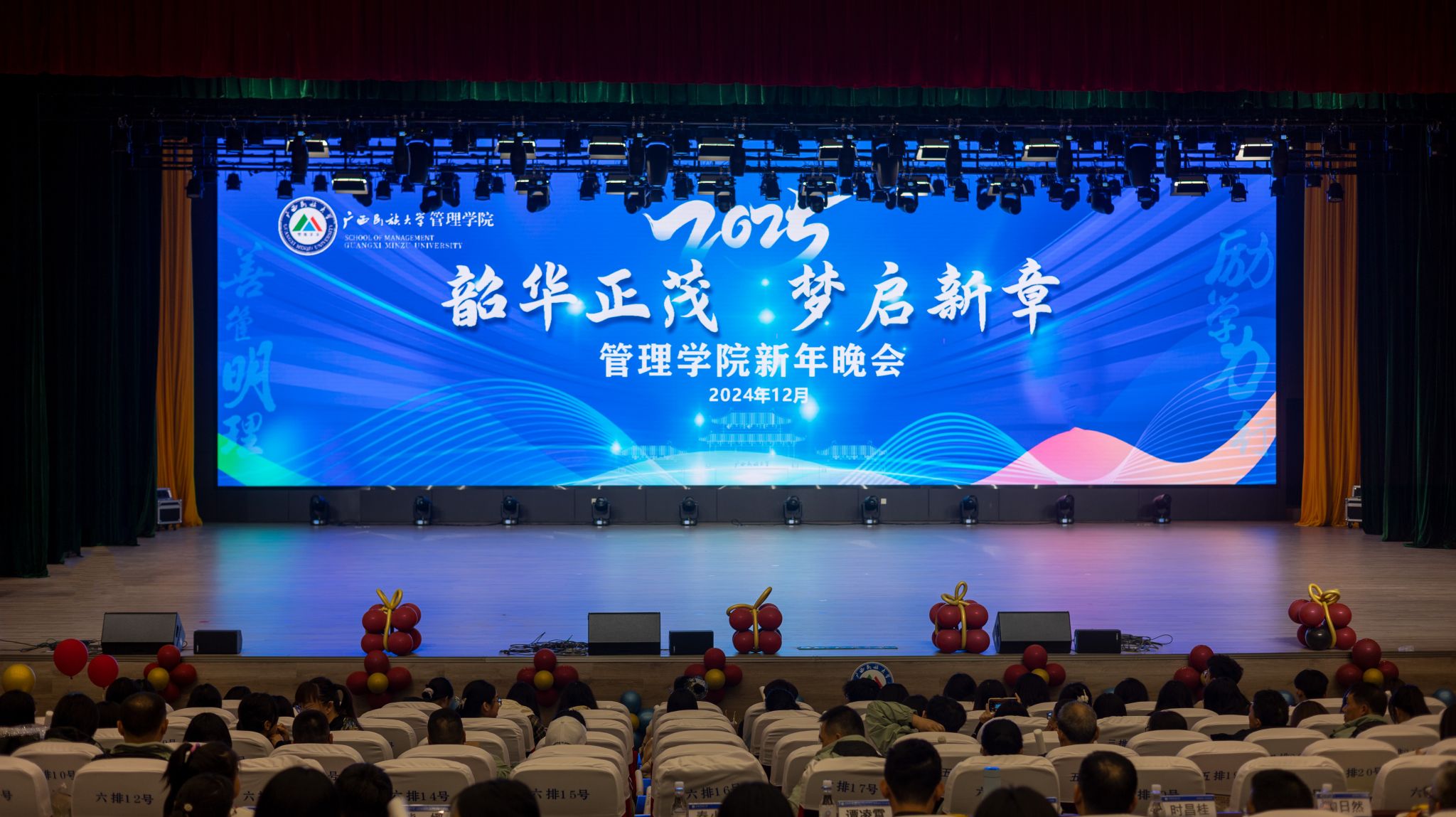 12月15日晚,广西民族大学管理学院“韶华正茂·梦启新章”迎新晚会在武鸣校区图文中心大礼堂盛大举行。管理学院全体师生欢聚一堂,共同庆祝即将到来的2025年。