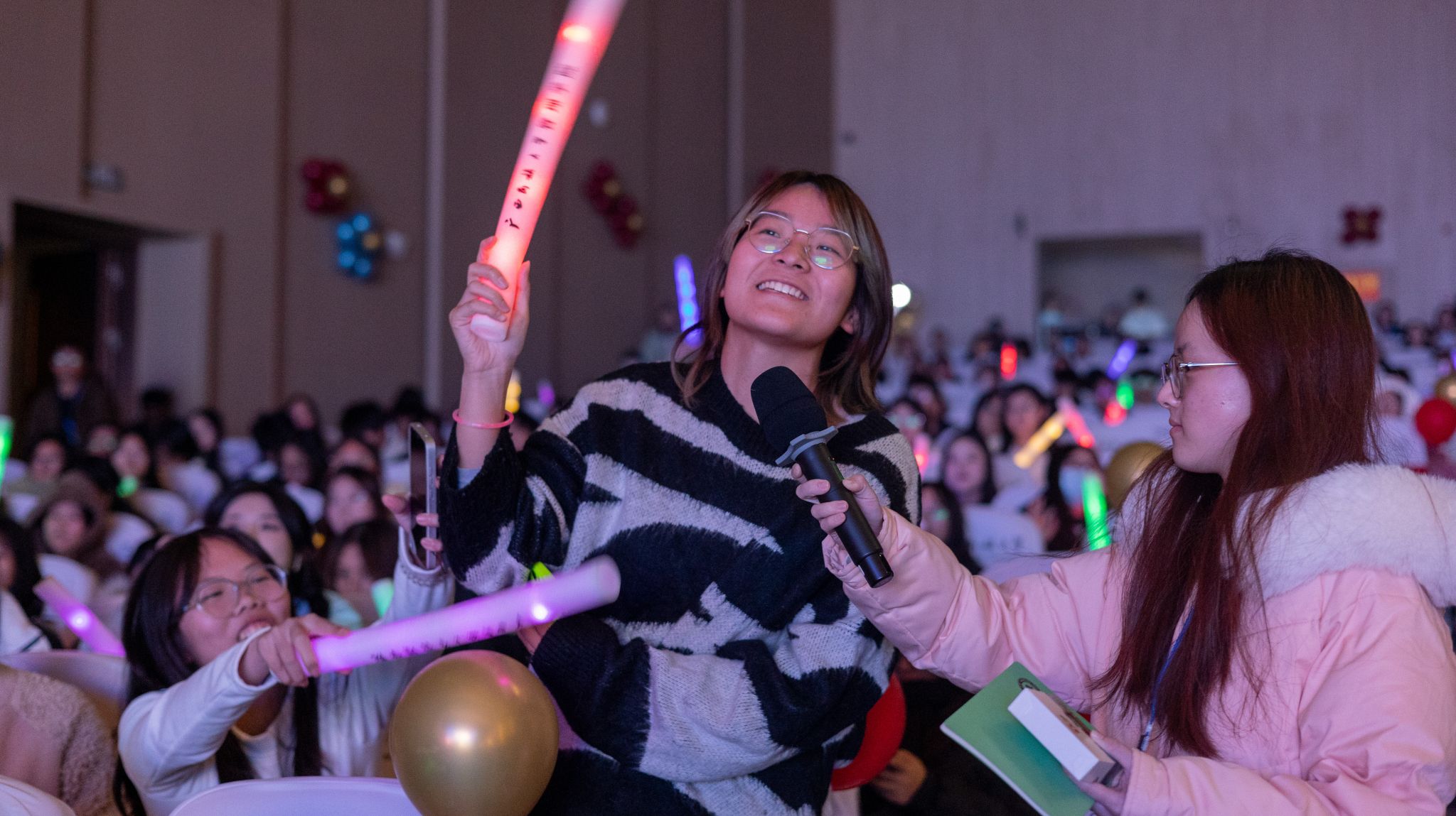 晚会还精心设置了中场互动环节:看图猜成语与听歌识曲游戏。同学们踊跃参与,现场欢声笑语不断,互动频繁,整个大礼堂沉浸在惊喜与欢乐中。