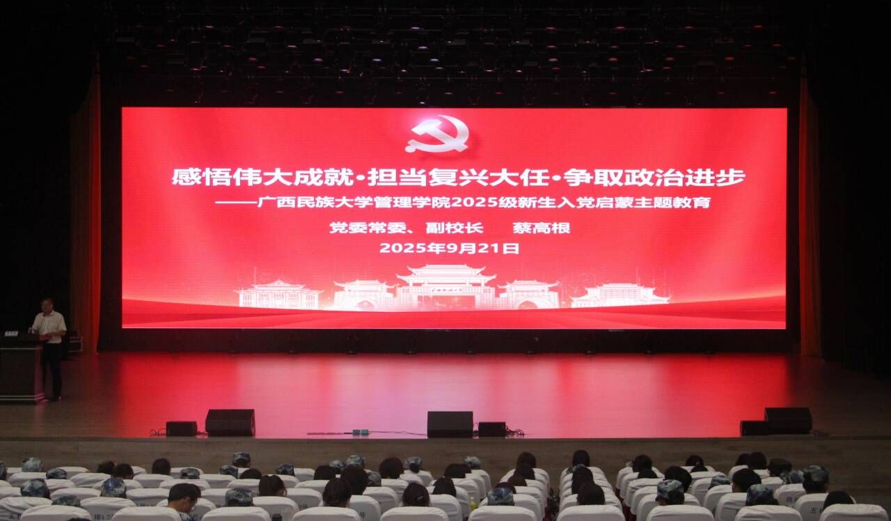 9月21日,管理学院面向2025级新生开展入党启蒙教育。本次大会由学校党委常委、副校长蔡高根主讲,旨在引导新生端正入党动机,积极向党组织靠拢。