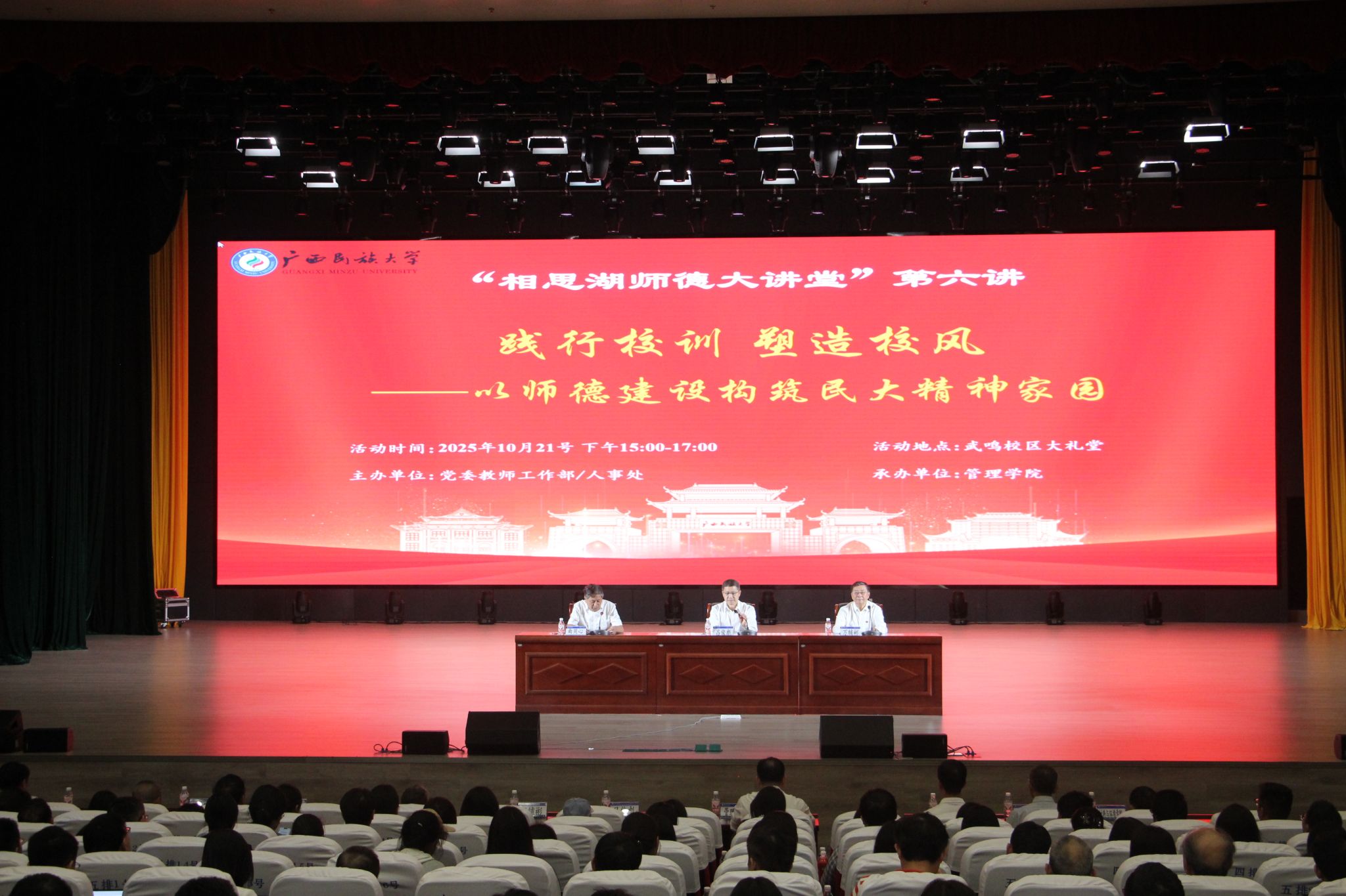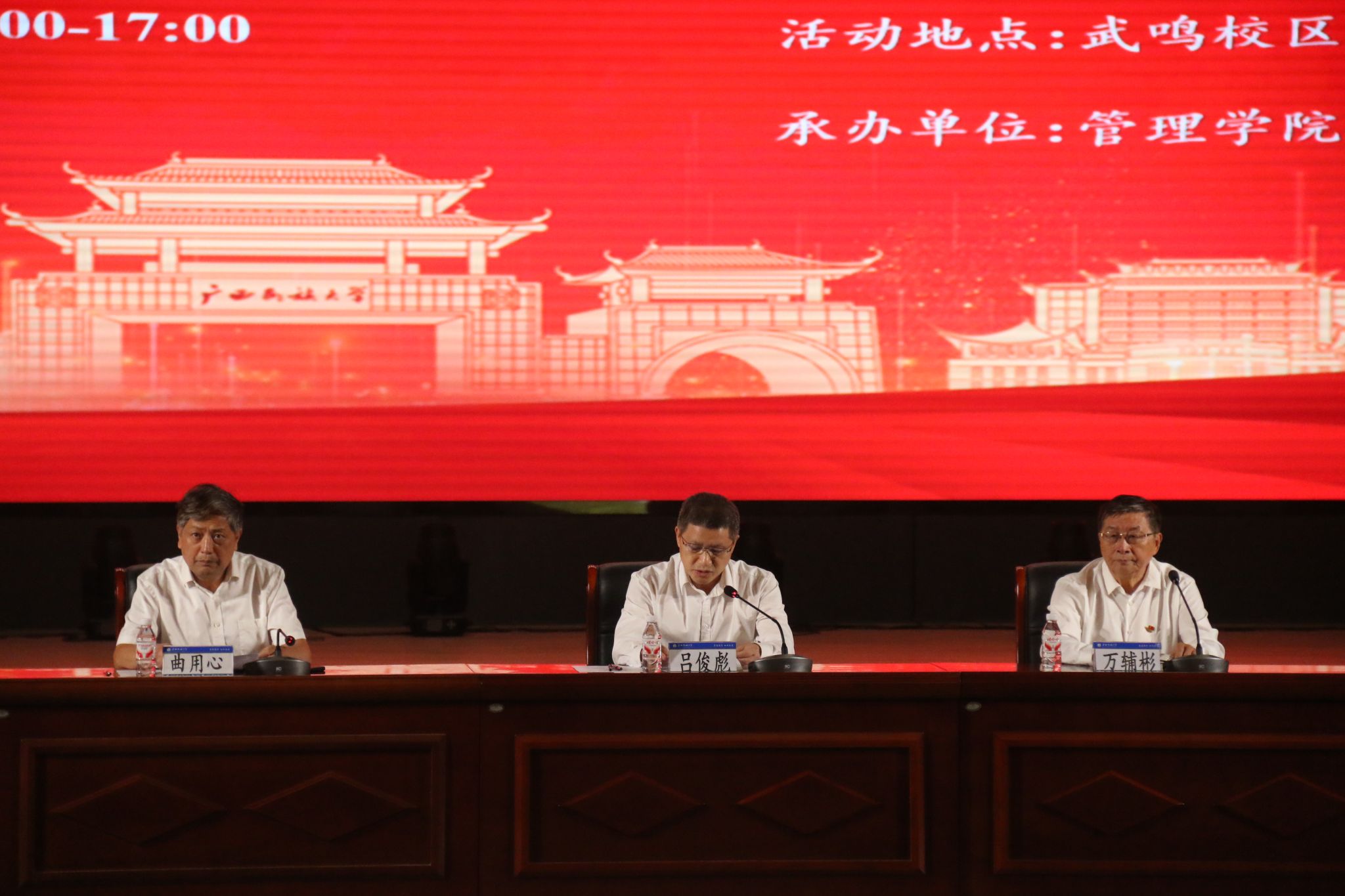 10月21日下午,“相思湖师德大讲堂”第六讲在武鸣校区图文中心大礼堂开讲。广西民族大学副校长吕俊彪出席讲座并致辞,广西民族学院原副院长万辅彬教授作“践行校训,塑造校风——以师德建设构筑民大精神家园”讲座,管理学院书记曲用心主持。