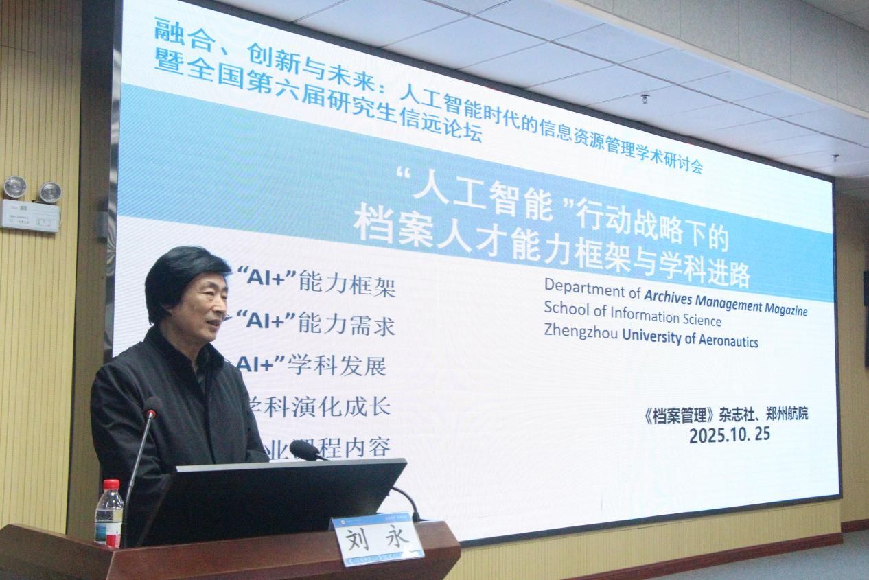 开幕式后是主旨报告,南开大学柯平教授以《人工智能时代信息资源管理学科的十大主题》为题,系统梳理了人工智能给信息资源管理学科带来的三大挑战,提出学科发展的十大关键方向。中国科学院张智雄教授带来《支持AI4S的科技文献知识底座构建思路和方法》,用详细数据和逻辑框架分享了其团队在科技文献知识组织与应用方面的前沿探索,为人工智能驱动的科学研究提供了知识底座构建方案。《档案管理》杂志社总编、郑州航空工业管理学院刘永教授作《“人工智能+”行动战略下的档案人才能力框架与学科进路》报告,从人才培养和学科发展角度,剖析了人工智能时代档案领域的变革与应对之策。三场报告视角多元、见解深刻,为参会者呈现了一场学术思想的饕餮盛宴。
