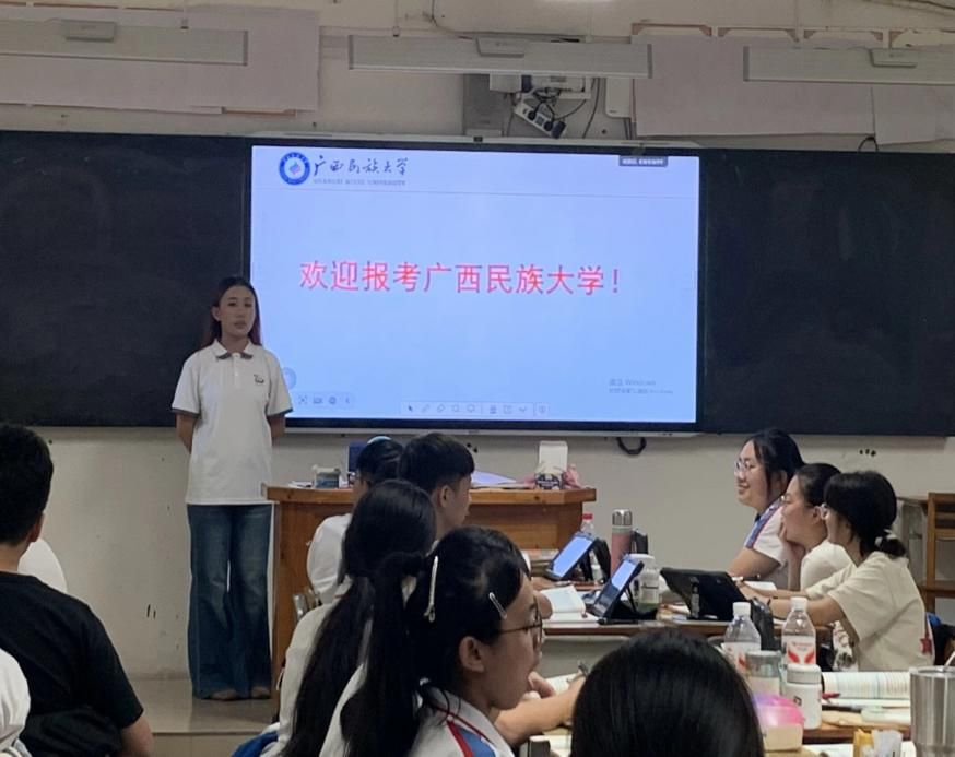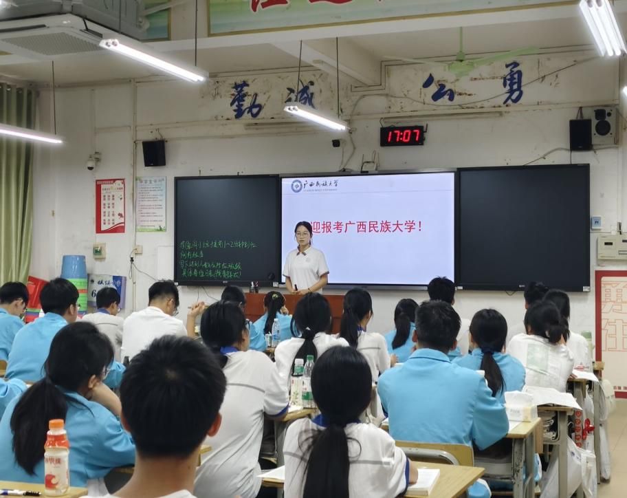 结合对大学的所见所闻和实践感悟,团队成员分别前往扶绥中学和巴马高中,面向高三学子开展宣讲。通过视频展示、PPT讲解、互动问答等形式,团队详细介绍了大学生活、专业设置、社团活动及招生政策。同时分享考试经验与心态调整技巧。宣讲活动获得了高中学子的积极响应,有效帮助他们明晰今后努力的方向。