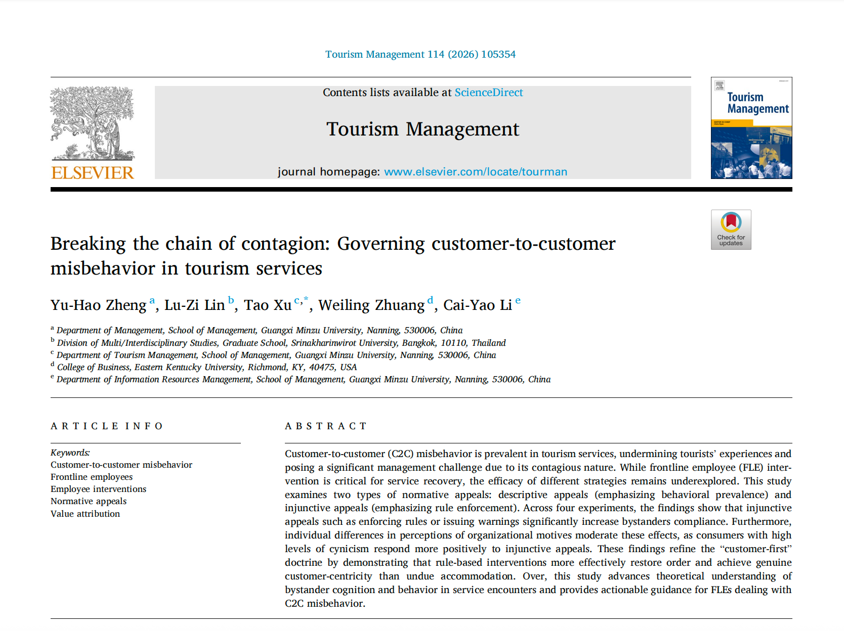 管理学院郑宇豪(第一作者)、徐涛(通讯作者)两位老师和信息资源管理系图书情报专业硕士生李偲瑶同学,联合泰国诗娜卡琳威洛大学的林陆子博士和美国东肯塔基大学庄伟凌教授,合作完成的论文《Breaking the chain of contagion: Governing customer-to-customer misbehavior in tourism services》,于2025年11月正式发表于旅游管理领域顶尖期刊Tourism Management(Volume 114, 105354)。此项研究成果标志着管理学院在ABS4等级的国际顶级学术期刊上发表论文实现了零的突破,体现了学院在管理学领域的学术积累与锐意进取。