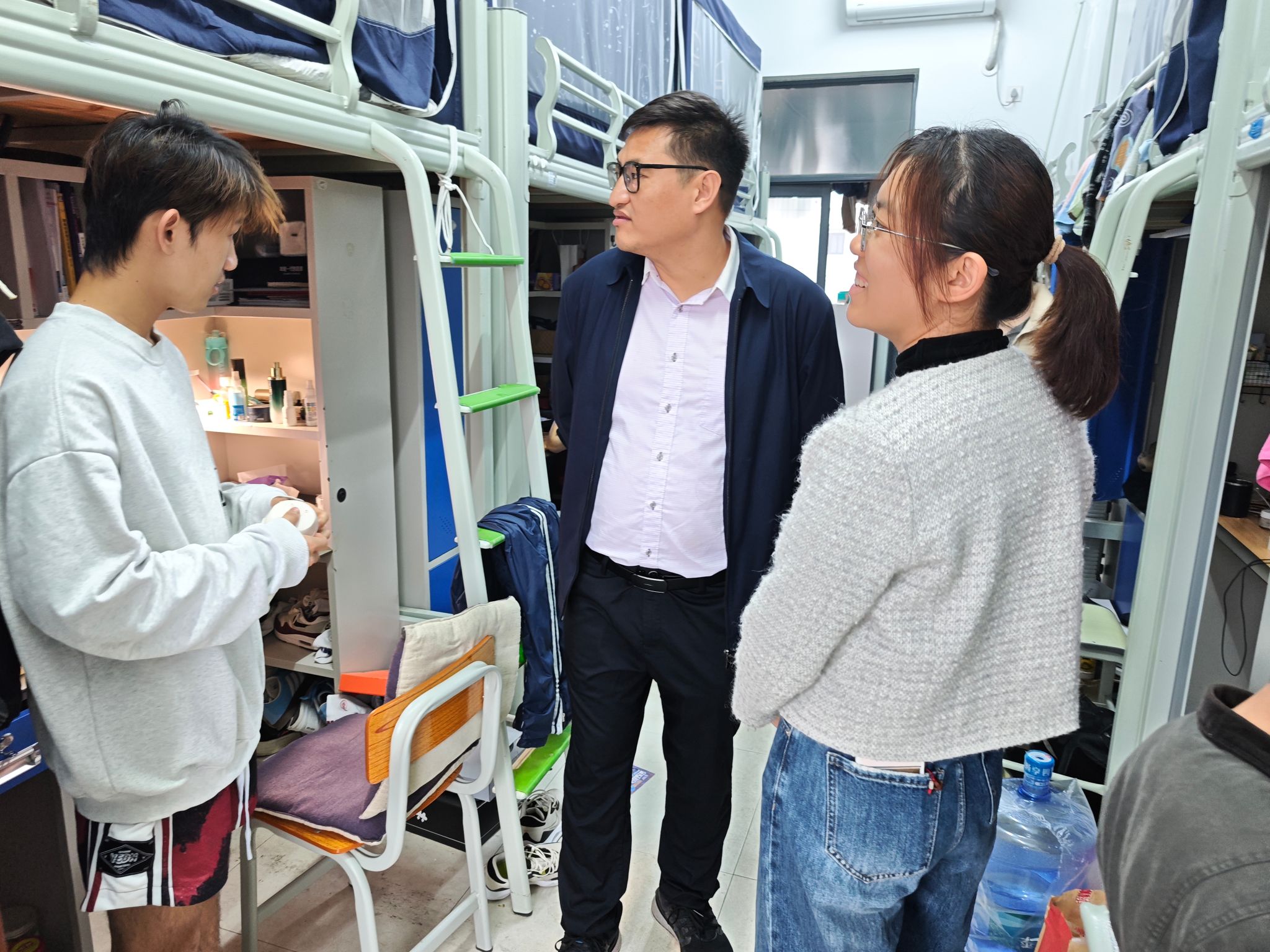 走访过程中,老师们深入学生寝室,亲切询问同学们的学习进展、生活适应情况和期末备考状态,细心听取同学们对宿舍管理、校园生活等方面的意见与建议。同时,他们还再三叮嘱同学们要牢固树立安全意识,做到规范用电、杜绝隐患,保持宿舍环境整洁,加强体育锻炼,合理安排作息,以积极饱满的精神状态迎接学期的尾声。