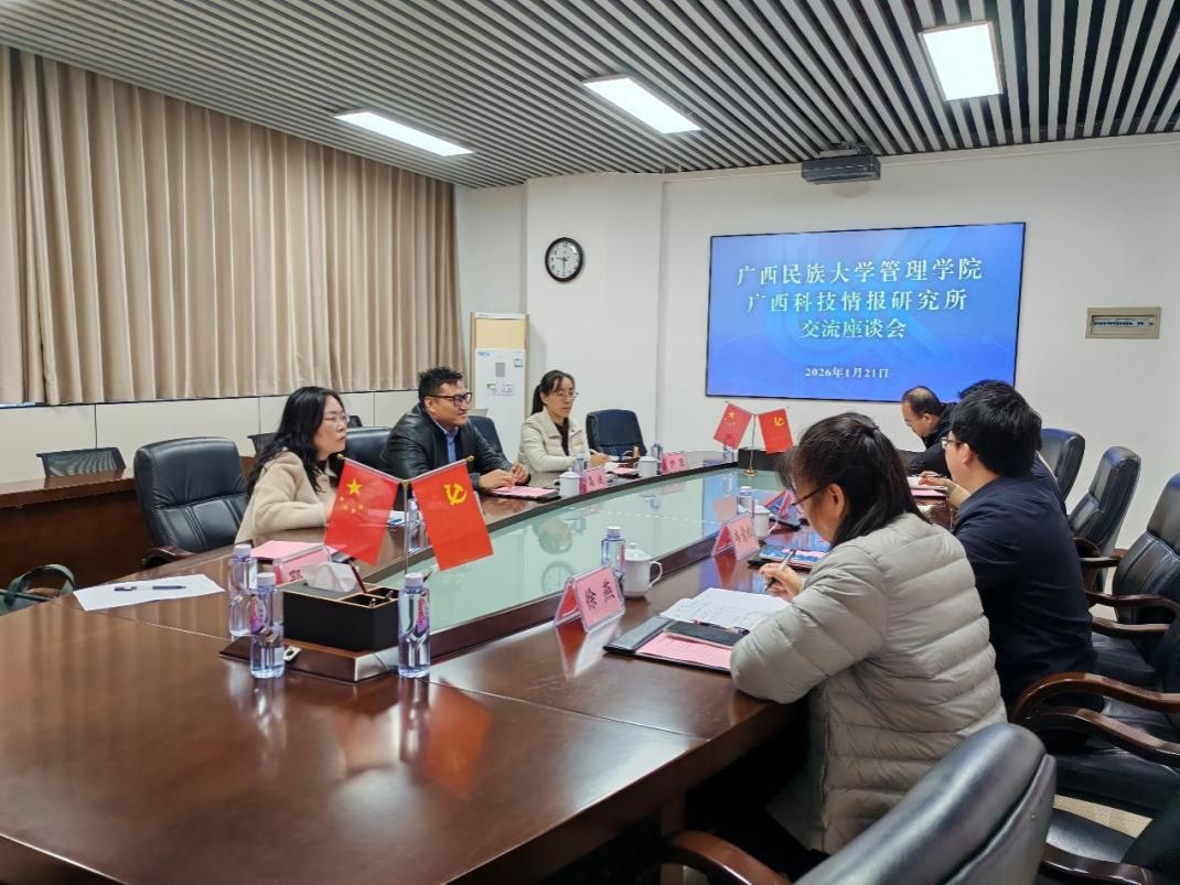 2026年1月21日,广西民族大学管理学院院长高斌率副院长郑慧、信息资源管理系主任饶圆和鄂尔江副教授一行,赴广西科技情报研究所和广西壮族自治区图书馆开展调研,旨在深化校所(馆)合作,拓宽合作领域。