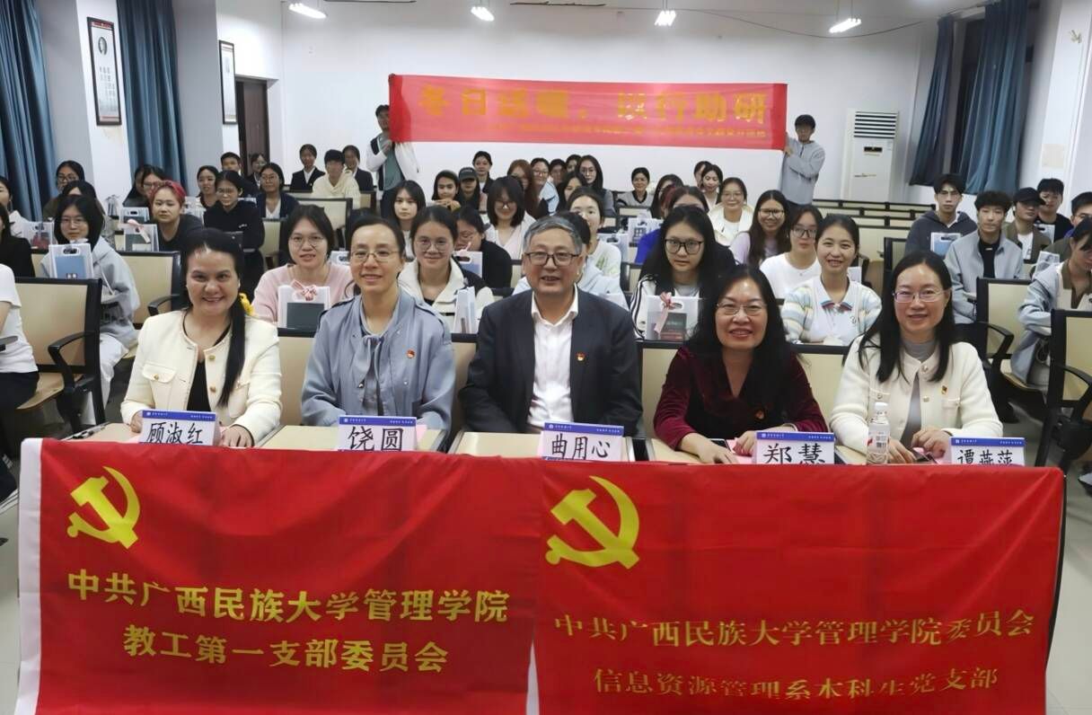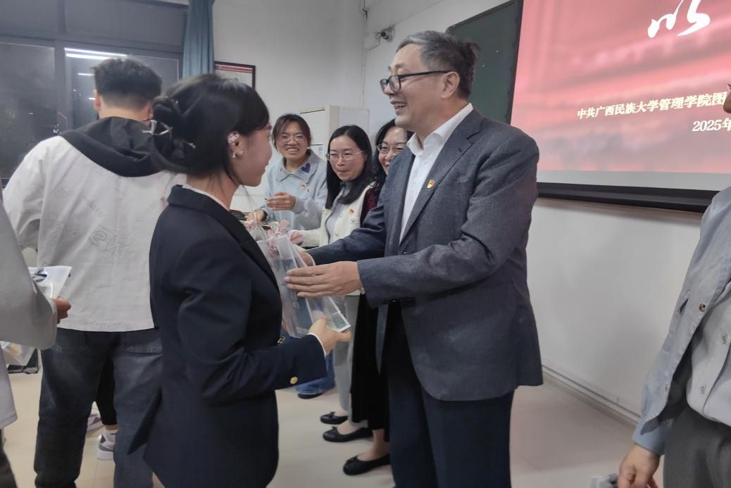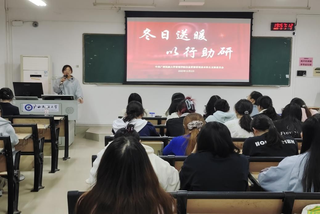 为切实发挥党支部战斗堡垒作用,助力考研学子坚定逐梦信念、从容迎战考研备考,12月2日晚,管理学院教工第一党支部、图书情报专业硕士研究生第二党支部、信息资源管理系本科生党支部在思源湖校区致远楼302室联合开展“冬日送暖,以行助研”主题党日活动。学院党委书记曲用心、副院长郑慧,各支部书记饶圆、归吉官、李咏纯和教师党员代表顾淑红、谭燕萍老师出席活动,支部委员和毕业生党员代表参与活动。